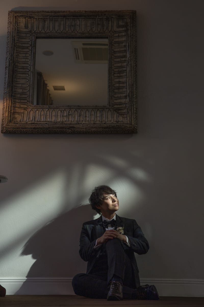 笑顔が爽やかな新郎様。背景に年月を重ねた柱時計が。