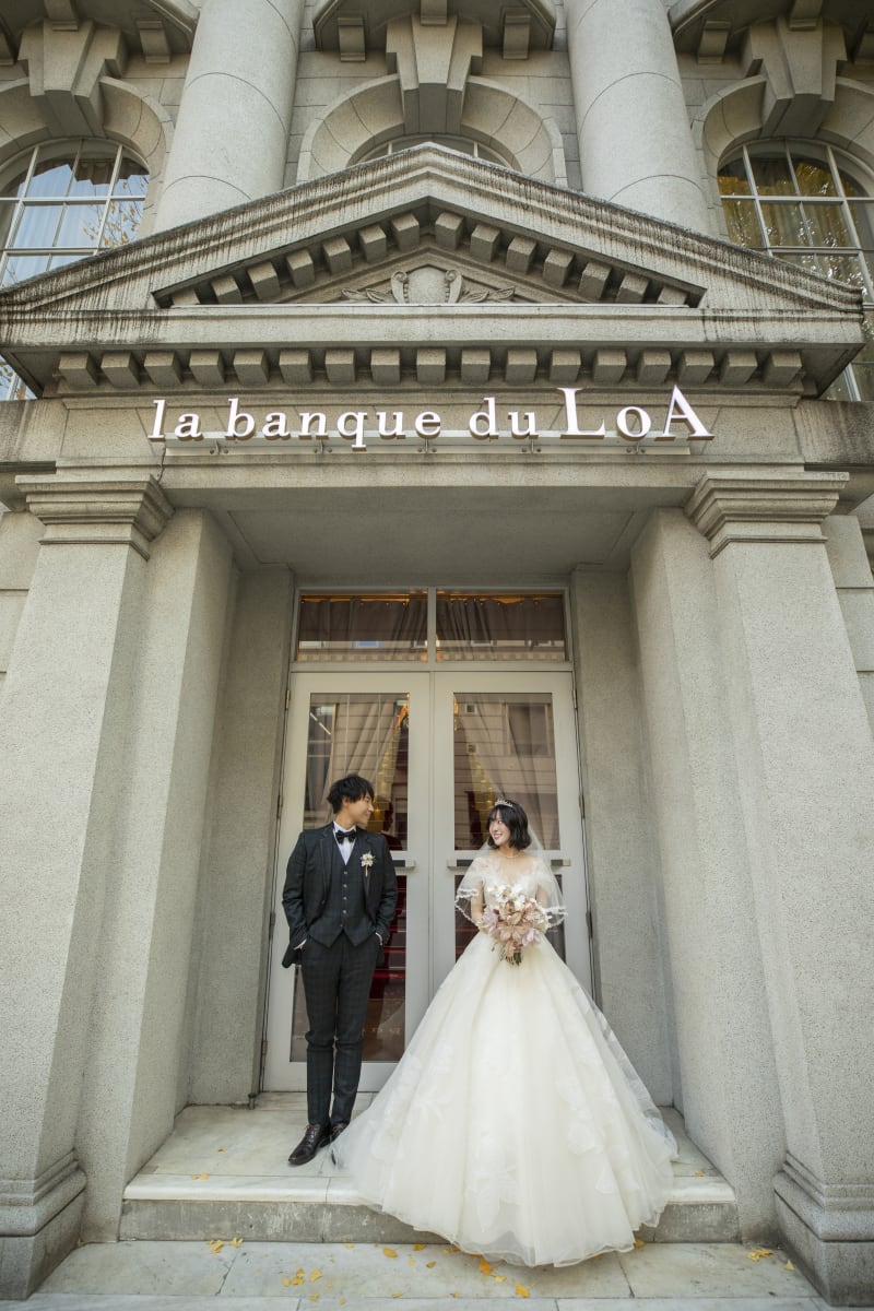 旧露亜銀行時代の半円アーチ窓の前で新婦様のソロショット。