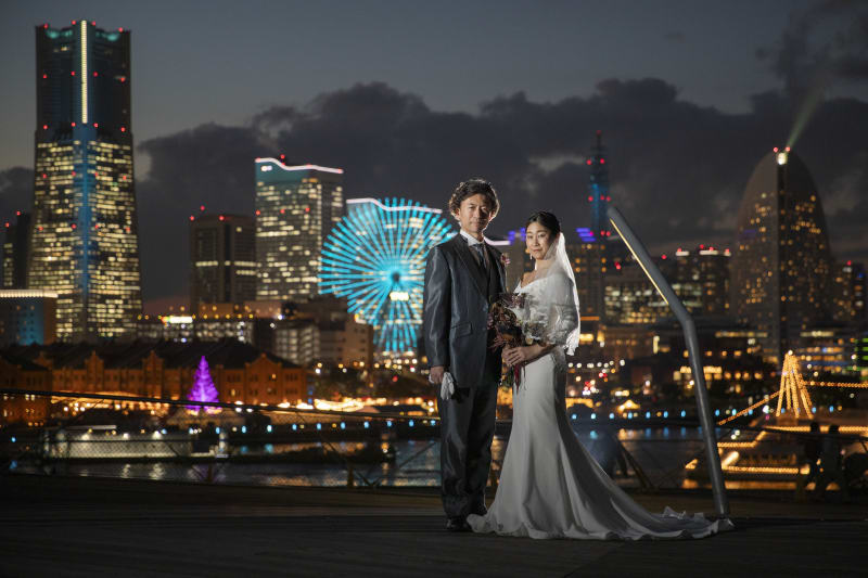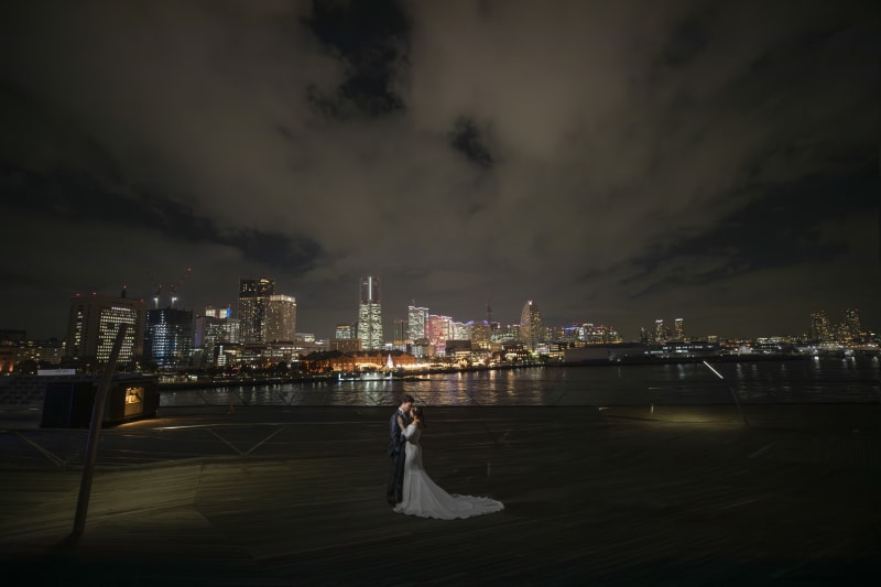 夜景に輝くみなとみらいの街を背景にお二人のフォーマルショット!