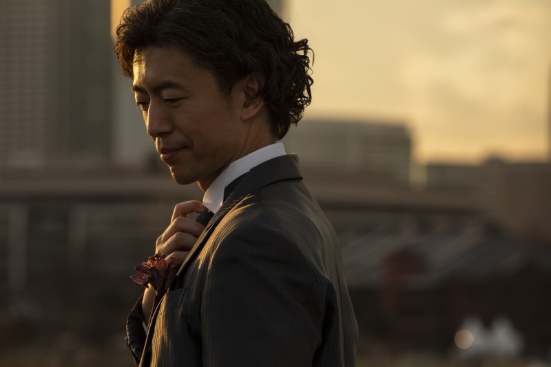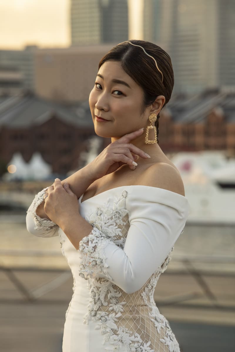 夕陽の柔らかな光を浴びての新婦様のソロショット。クールに決まります。