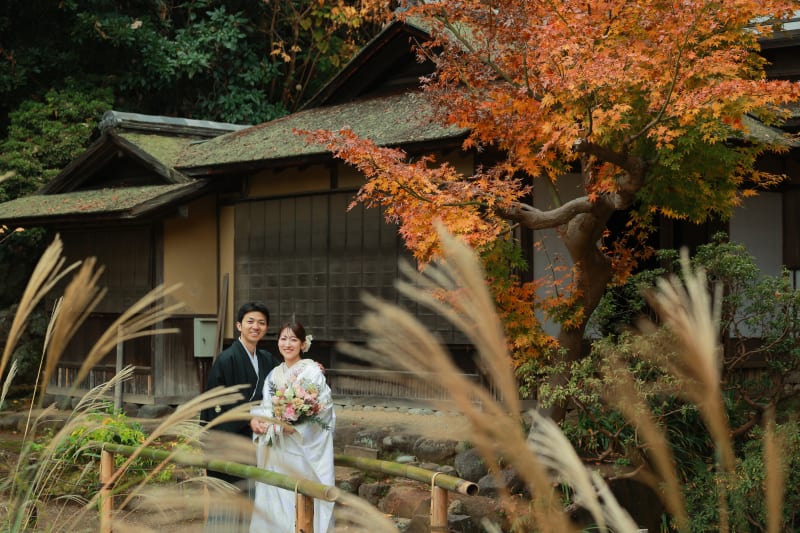 紅葉のグラデーションが美しい場所。常緑の緑もいいコントラストになっており、お二人の白無垢&黒紋付が浮き立ちます・・!