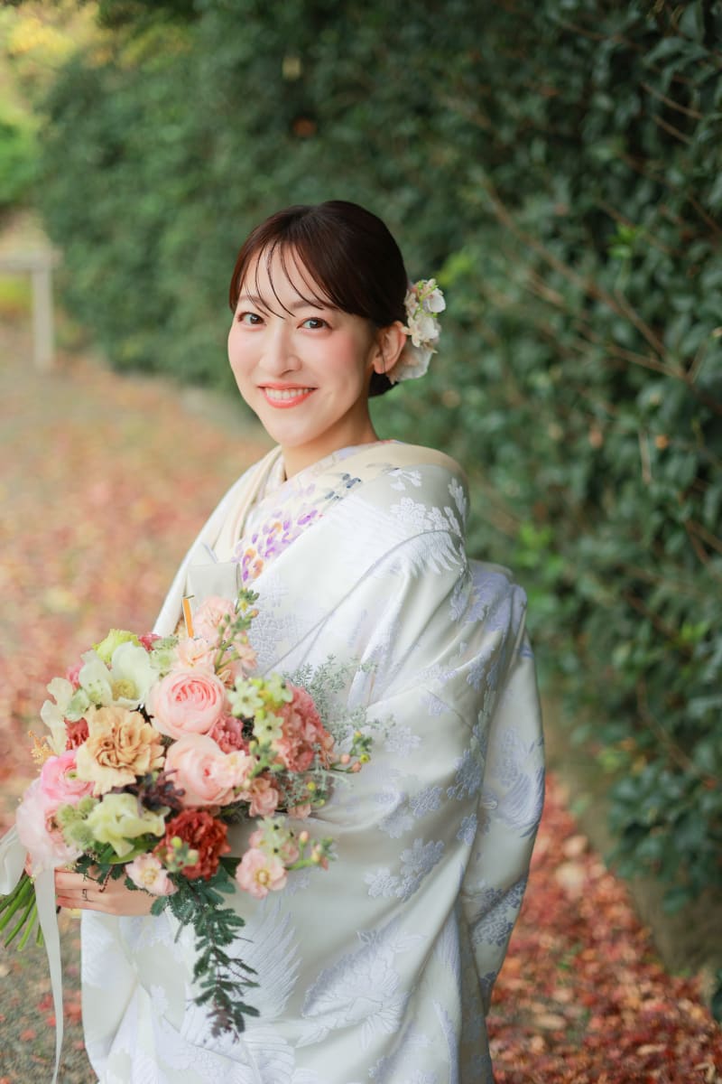 ブーケに使用したお花を着物の胸元に挿して小物風に♪