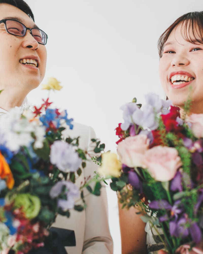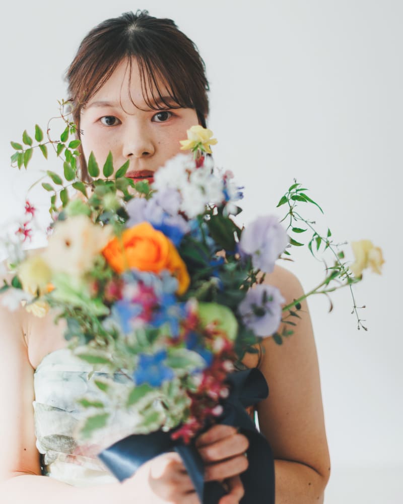 自ら監修されたハイセンスなブーケを手に、お花を愛するプロならではの透明感あふれる写真が完成しました。