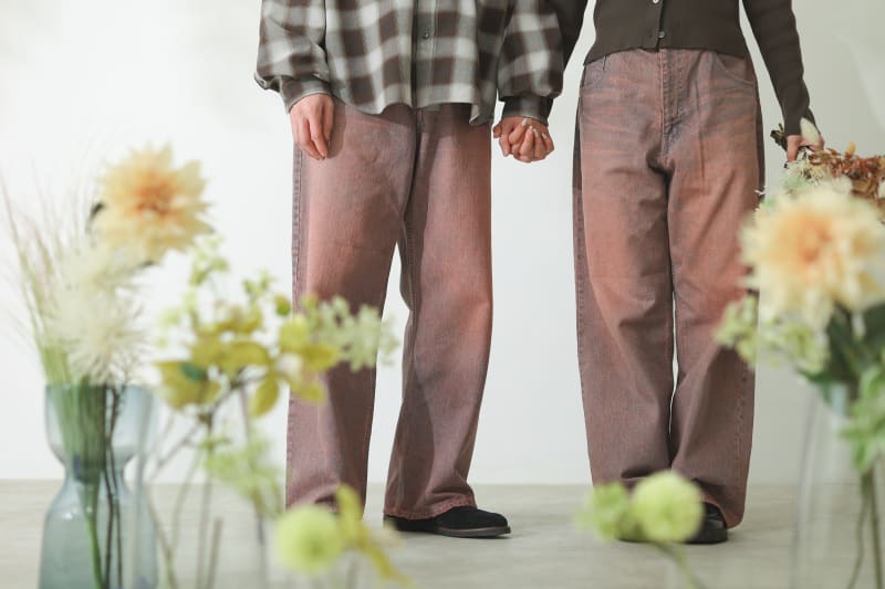 ブラウンのカジュアルなリンクコーデがお似合いのお2人。ファッションにしっかり目がいくシンプル空間で撮影。