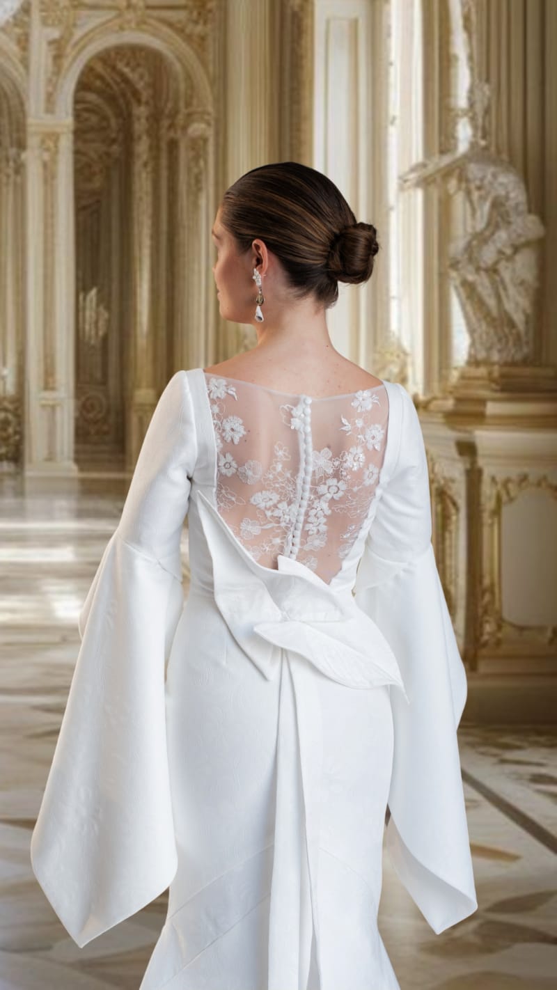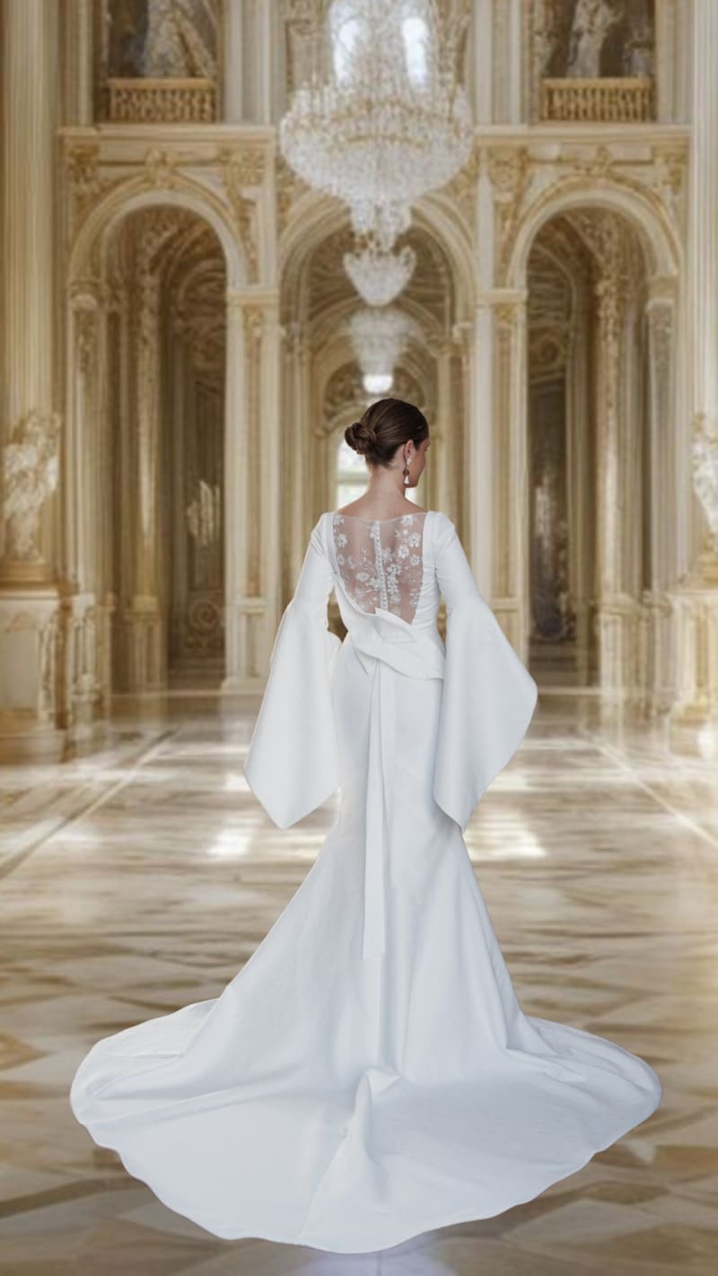 背中には繊細なレースをあしらい、正面の端正な印象から一転、奥行きのある表情を演出。やわらかく広がる袖のデザインと、背中で結ばれたリボンが、クラシックな佇まいの中に女性らしい余韻を残します。時代や流行に左右されない、永く愛されるエレガンス。本質的な美しさを大切にする花嫁のためのドレスです。