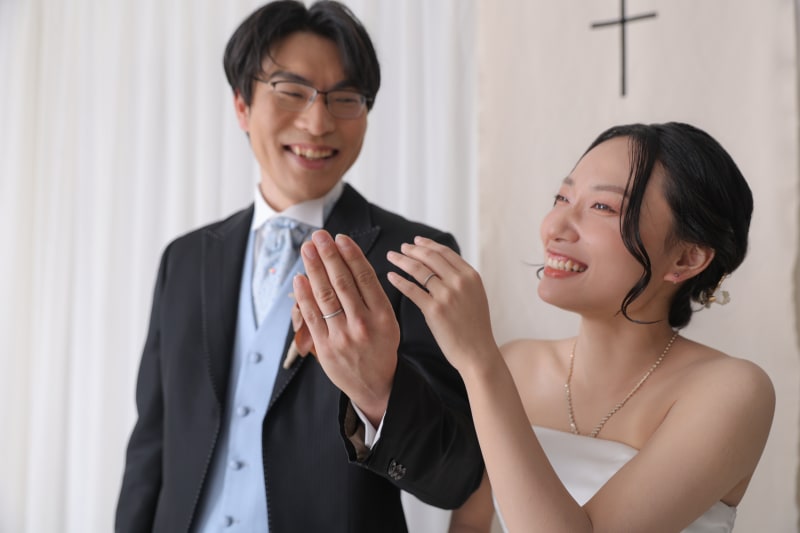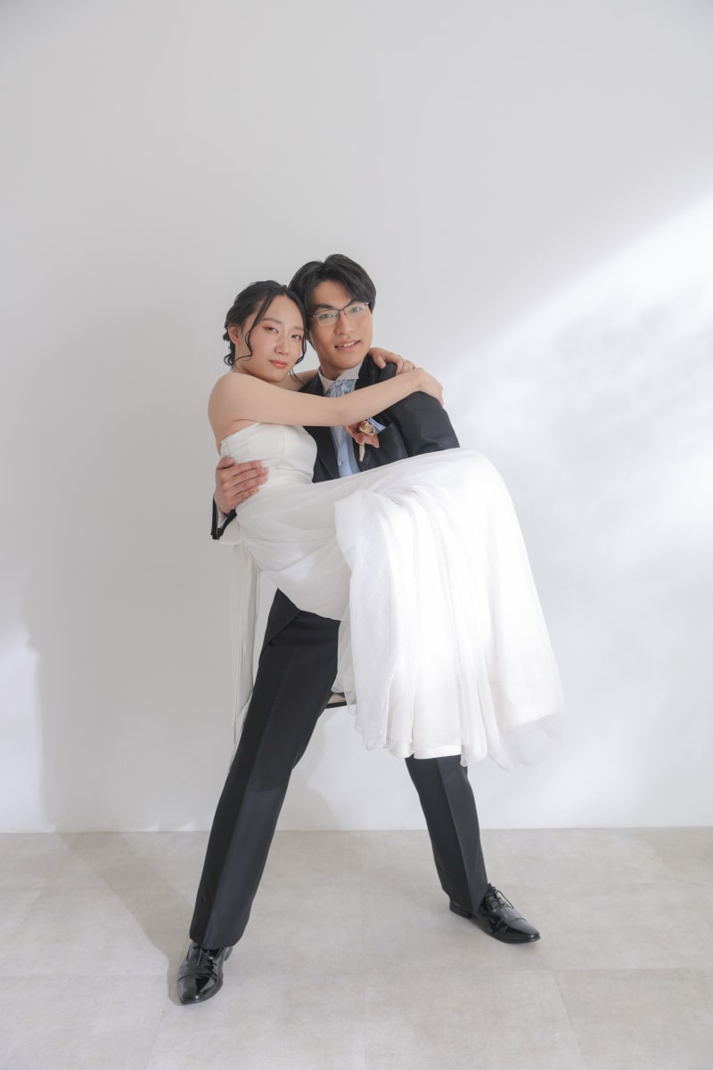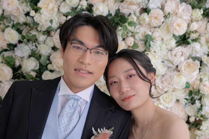 指輪を披露し合う弾けるような笑顔や、花々に囲まれた至近距離のカット。お二人の幸福感がダイレクトに伝わる写真は、スタジオならではの柔らかなライティングがその美しさをより一層際立たせています。見つめ合う瞳に、確かな愛が宿る瞬間です。