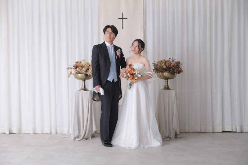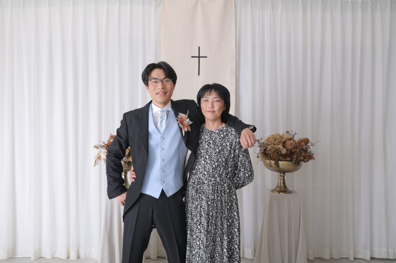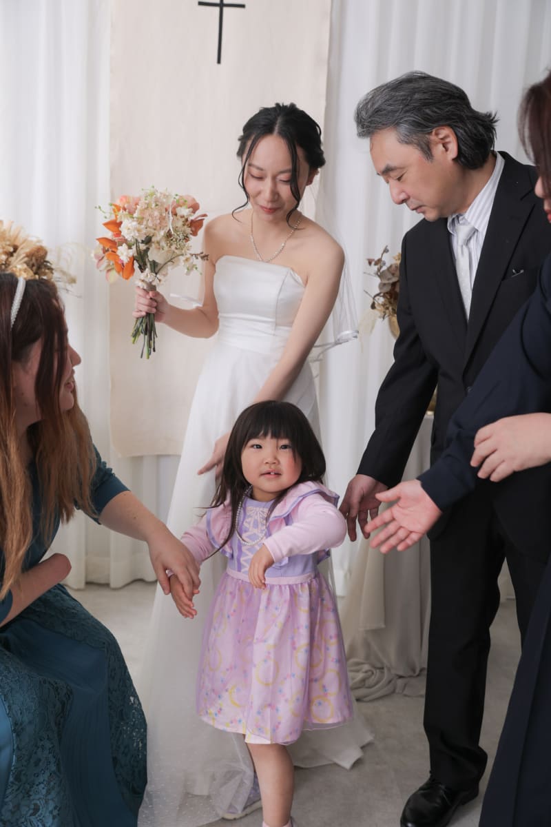 純白のカーテンと十字架が印象的なセットで、撮影はスタート。ご両親との絆を感じる一枚や、お子様の可愛らしい飛び入り参加もあり、終始笑い声が絶えないアットホームな時間に。大切な人たちに見守られながら、感謝の気持ちが溢れ出す温かなシーンとなりました。