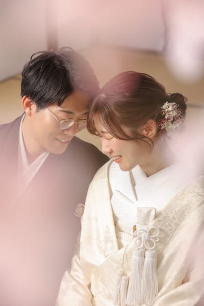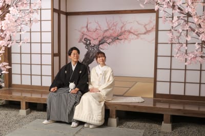 白無垢を着て撮影。白壁や、桜のアーチ、縁側さまざまな雰囲気で撮影できます!