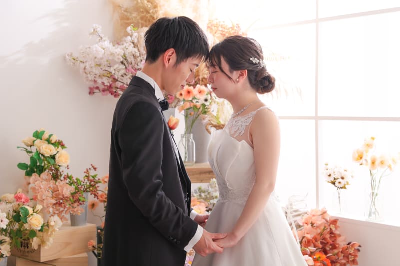 新郎様からお花をプレゼントショットです! 白背景にお花が映えますね!