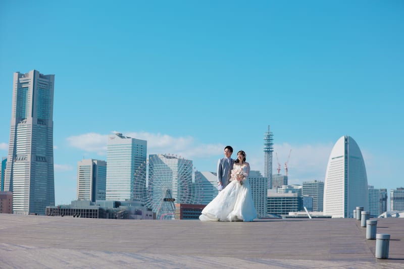 定番ながらも一度はとってみたいとお声が多い横浜三塔の絵。今日の記念にぜひ!快晴ならお二人の影も映ってより面白い写真に。