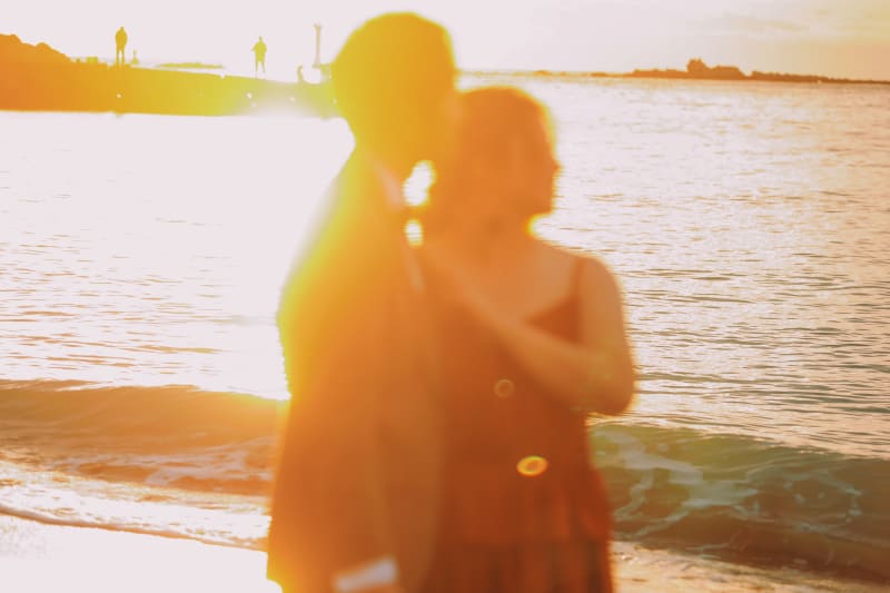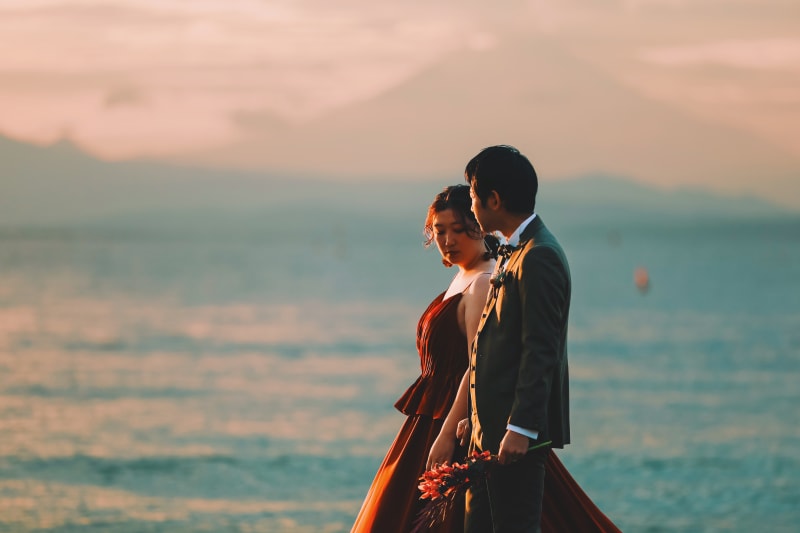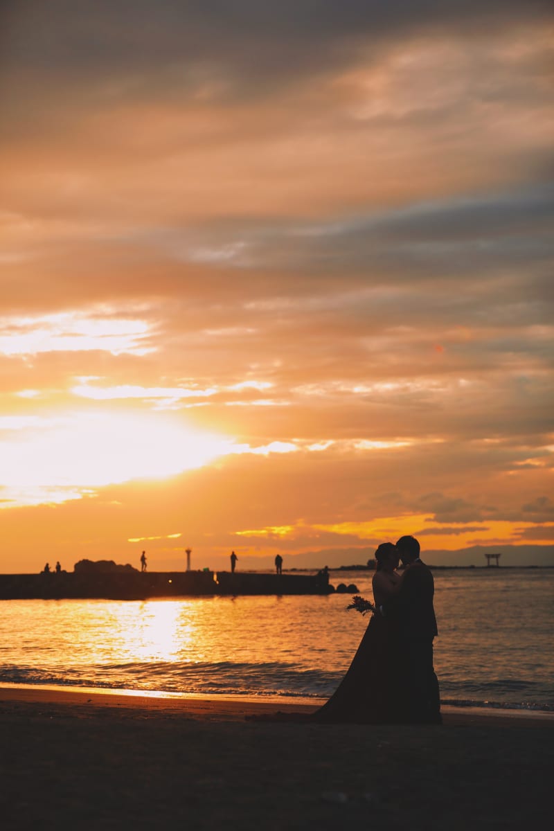夕暮れのシルエット。2人の形だけ。フォトボードにもおすすめのカットです。
