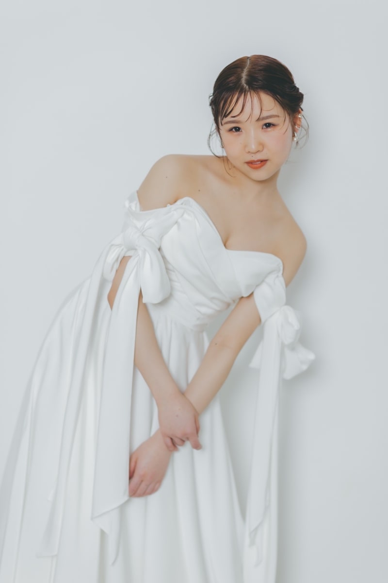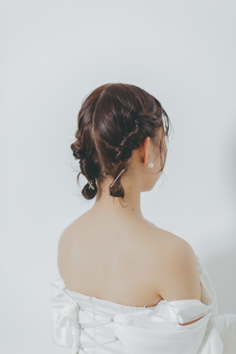 同じカラードレスですがダウンスタイルもご紹介!顔まわりにニュアンスをつけてタイトなヘアにしました。