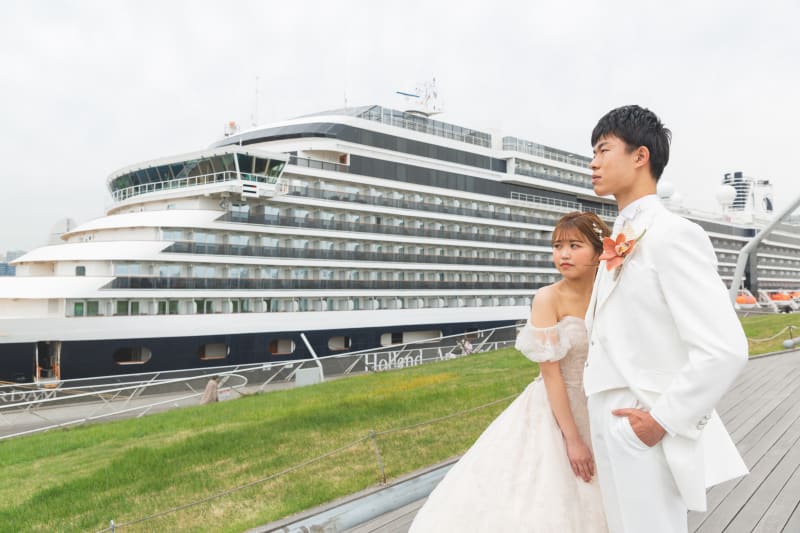【横浜で記念日】汽笛が二人のスタートを祝う横浜のロケーションで美しい一枚を