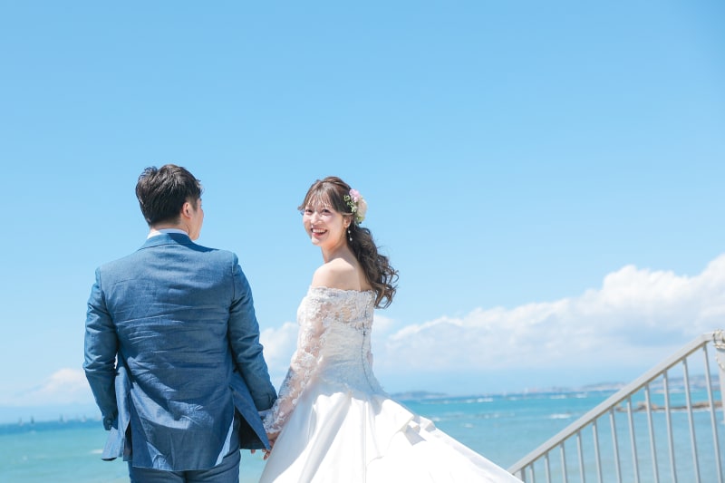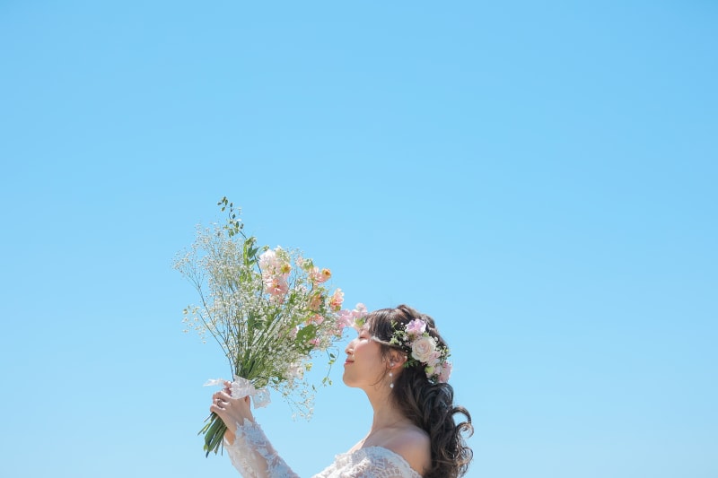 真っ青のキャンバスにお嫁さんが印象的。ブーケの香りをいっぱいに吸って。