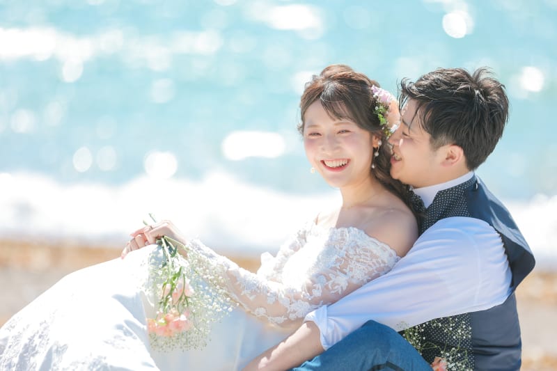 海辺で旦那さんに囁いてもらいました♪お嫁さんいい笑顔すぎる!照れてるお二人が可愛かった!