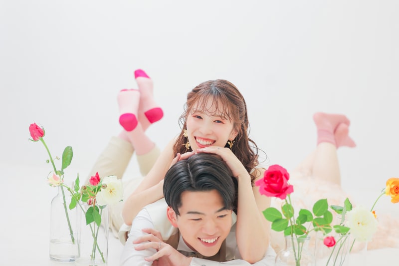 お母様のお家で育てているバラをご持参くださったので、撮影小物として大活躍させていただきました!偶然旦那さんのソックスとリンクしてました