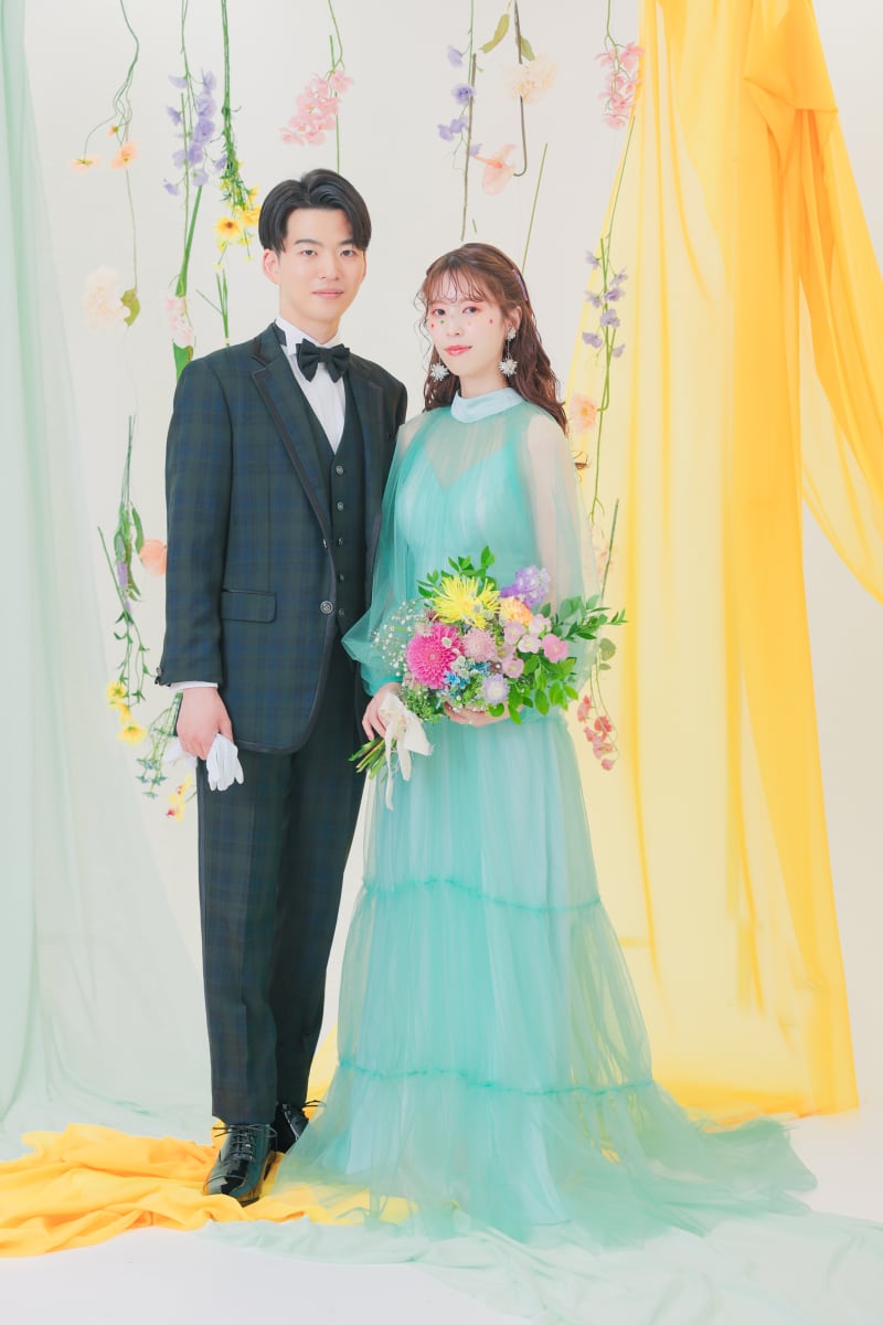 旦那さんのタキシードもカラードレスのグリーンを拾ってディープグリーンのチェックで統一感♬背景の布もカラーチェンジ♬