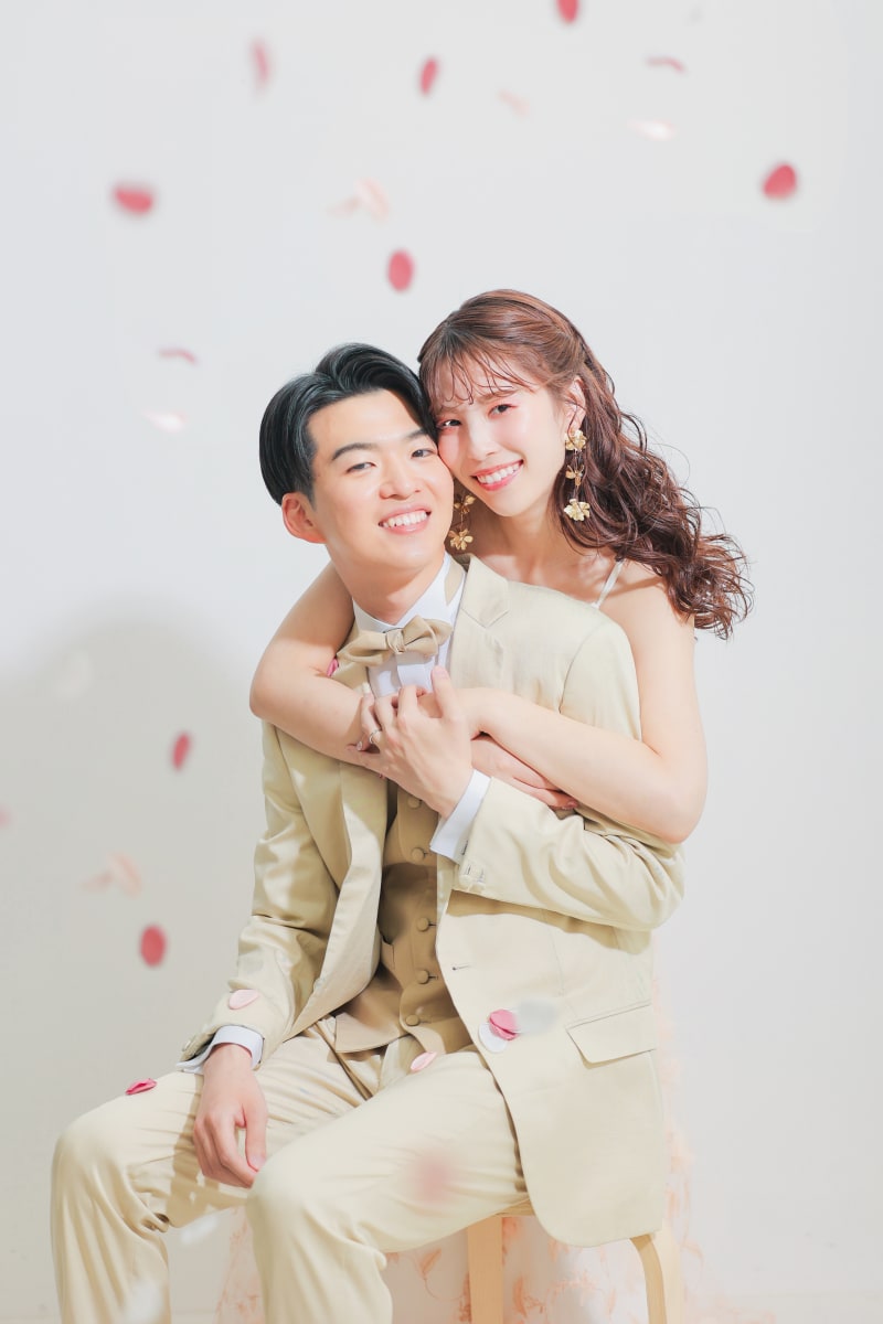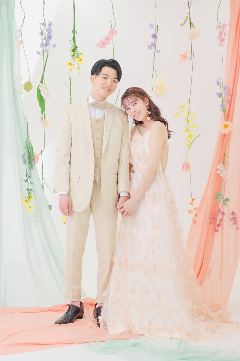 ドレスとお揃いのカラーカーテン背景で淡い雰囲気で可愛い♡