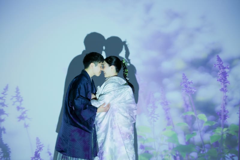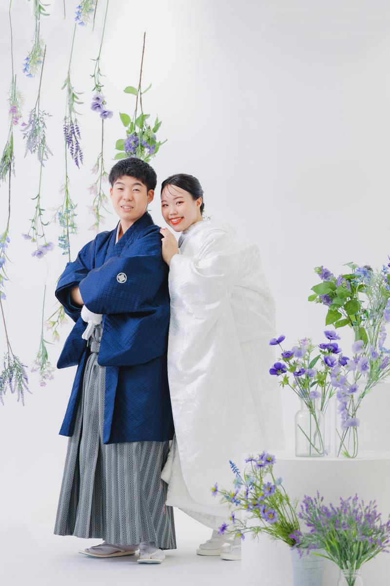 2人の好きな青色の世界でお二人のコーデの青色に合わせて背景を作成してみました♪お花のカーテンで華やかに♪