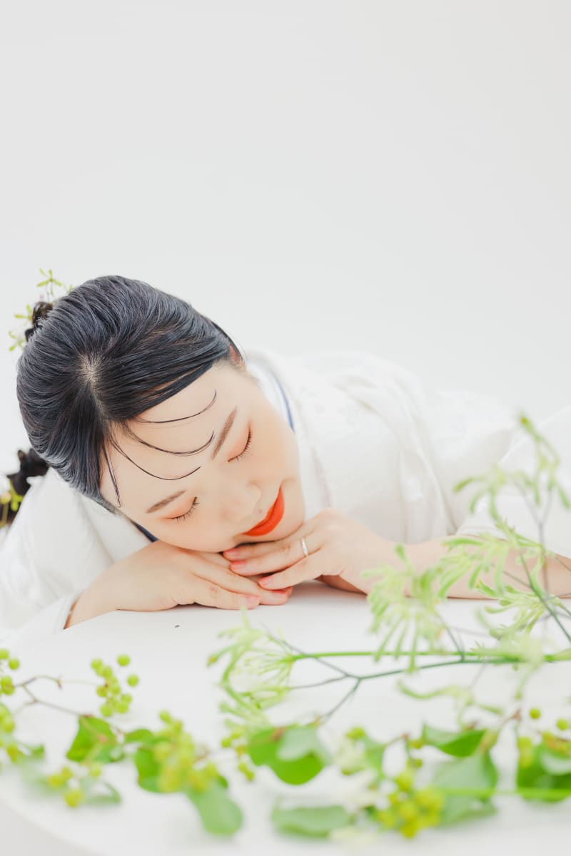 オレンジメイクまぶたのオレンジやリップがとっても映えます。グリーンの枝物とコントラストを出して爽やかに。