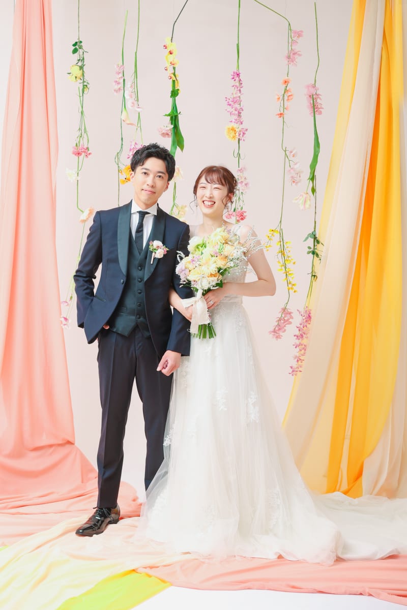 淡い色がお好きとお嫁さんのお好みに合わせて背景セットをお作りしました!造花のカーテンとスプリングカラーのカーテンが可愛らしいですよね♡