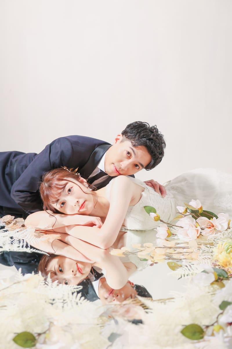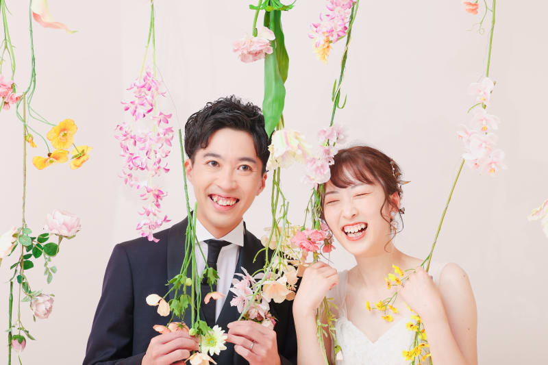 お花でお二人を囲って。ブーケやヘアアクセサリーをさりげなく見せてお二人の個性を表現して。