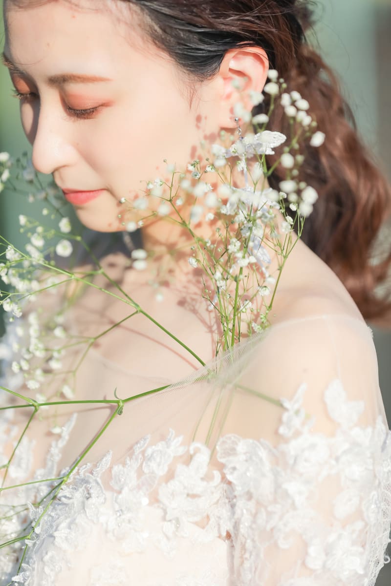 美しいお嫁さんには美しい花を添えて✳︎襟元に白いカスミソウを添えてアートな感じに。