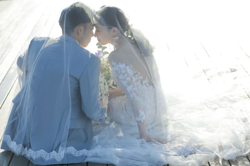 ベールを被って幻想的に。光に包まれたお二人が幻想的ですね。