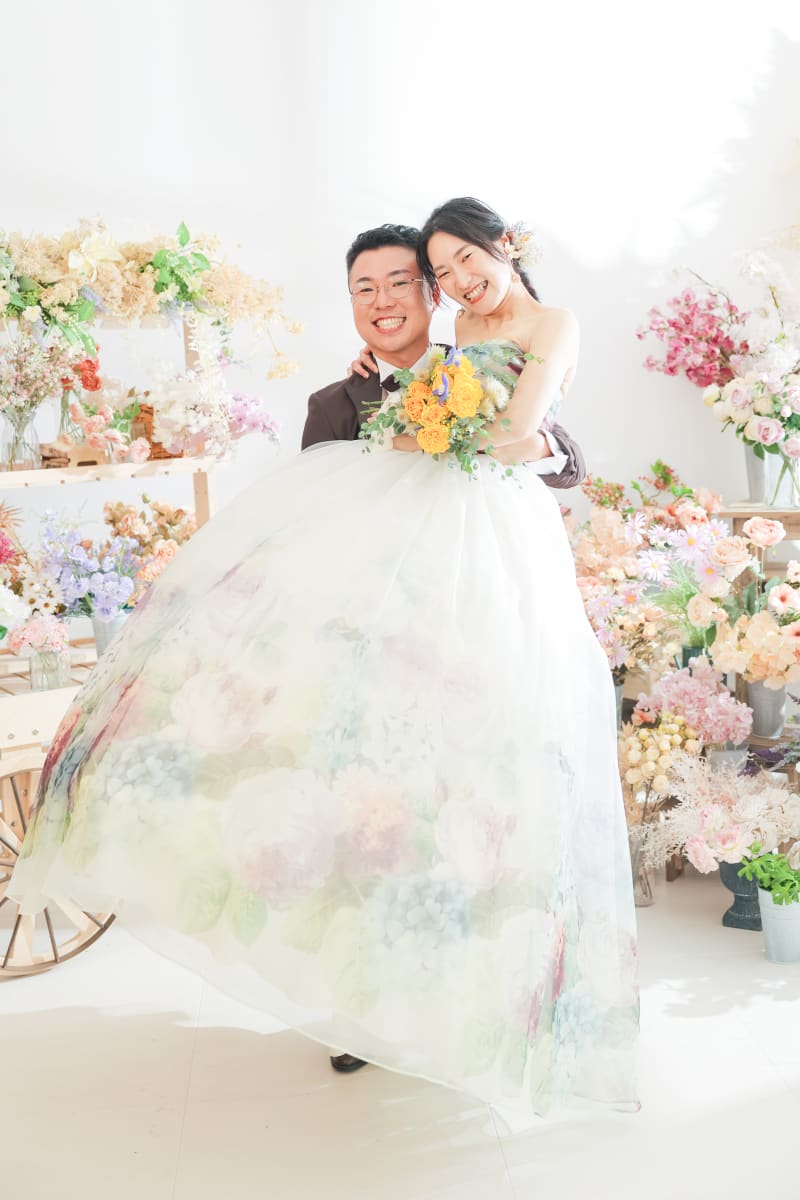 お姫様だっこドレスでぜひ撮りたいカットです!ぜひブーケもお手元に添えて華やかに♡
