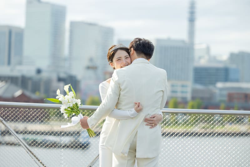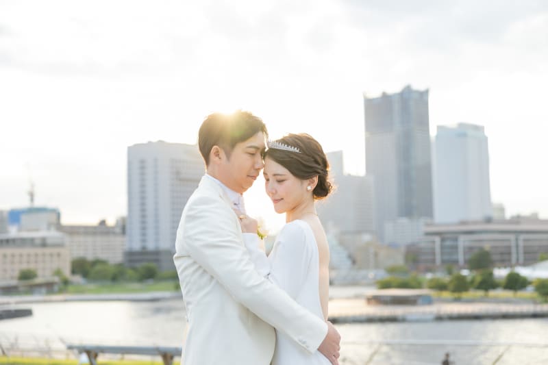 【横浜で記念日】汽笛が二人のスタートを祝う横浜のロケーションで美しい一枚を