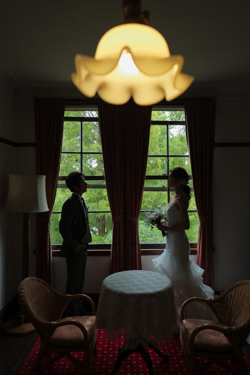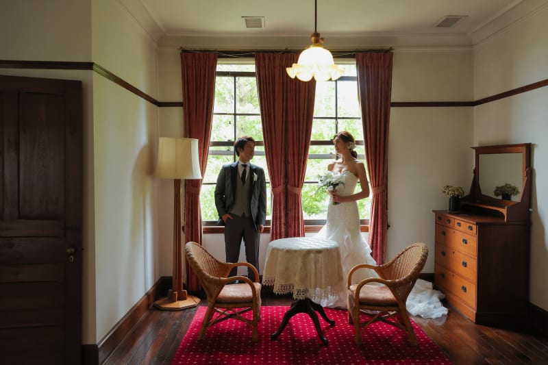 光差すサンルームで待つお嫁さんと廊下に佇む旦那さん。洋館のしっとりした雰囲気と外の新緑のコントラストが美しい。