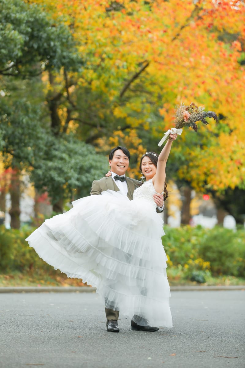 ウェディングフォトでリクエストの多いお姫様抱っこのポーズは鮮やかな紅葉の前で元気に!