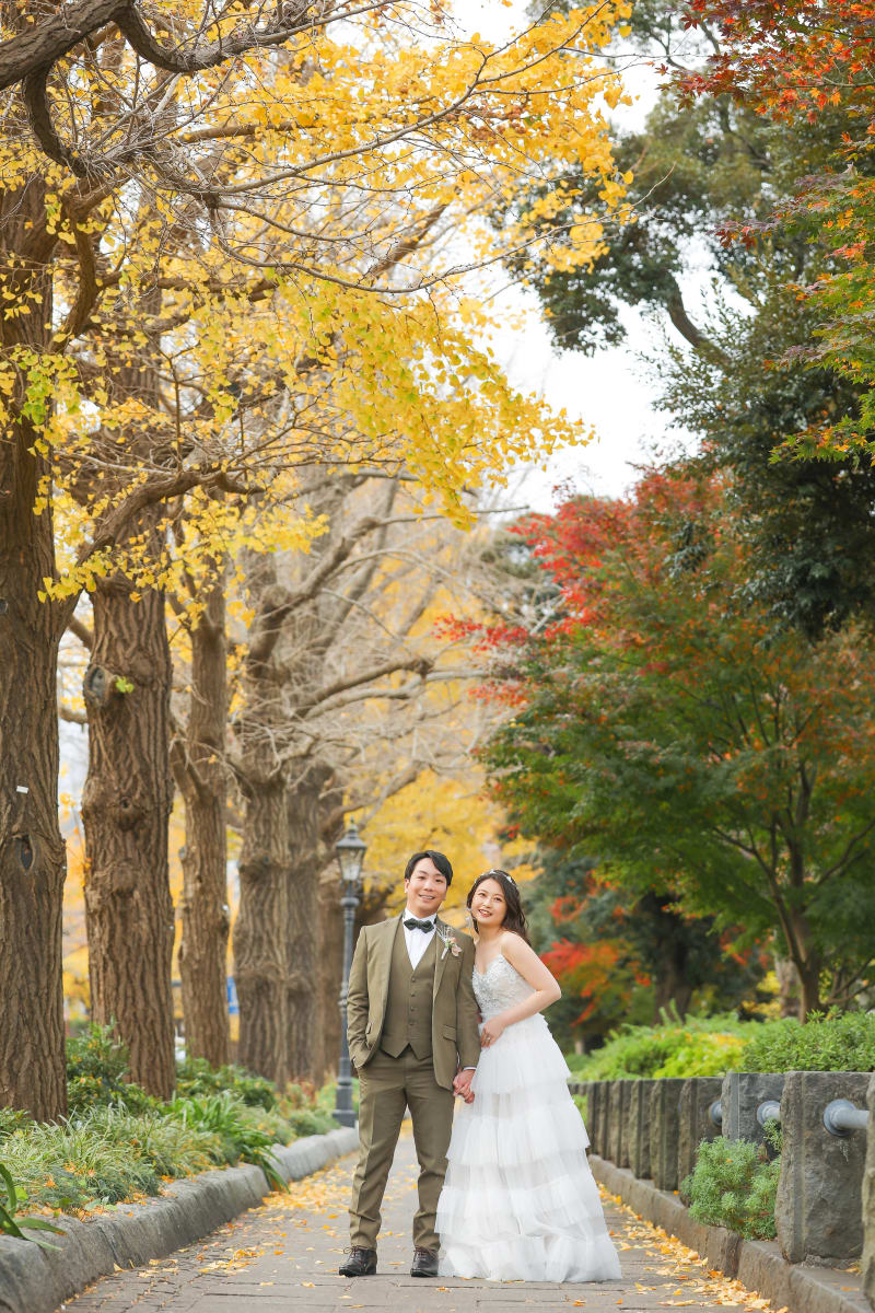 12月初旬の山下公園の道。いろとりどりの紅葉が綺麗です。黄色の銀杏の紅葉はドレスにもピッタリ!