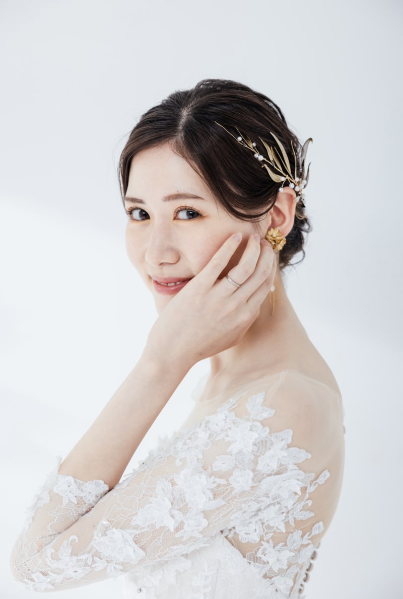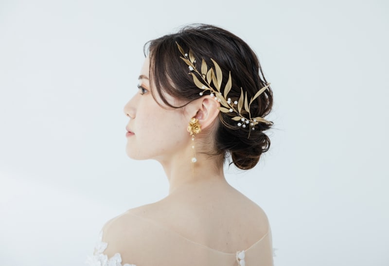 洋装では同じアップスタイルでも雰囲気を変えてエレガントに。