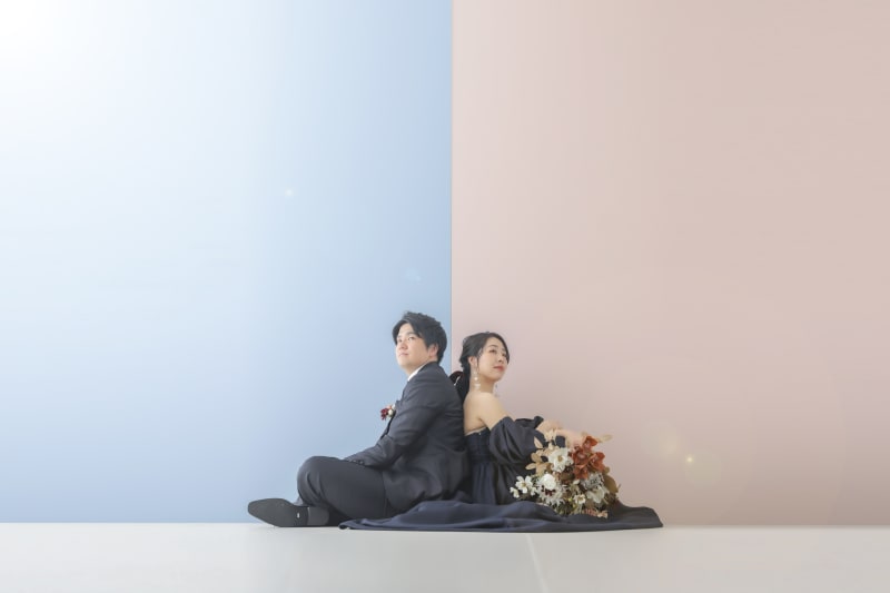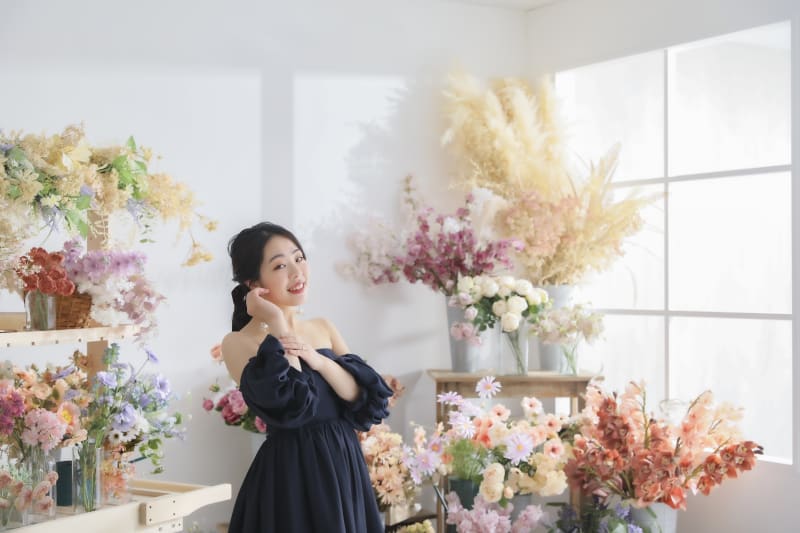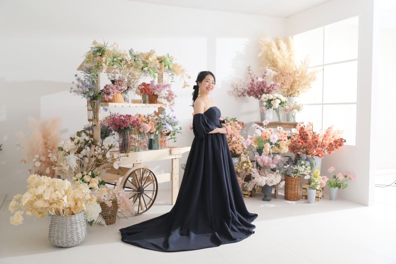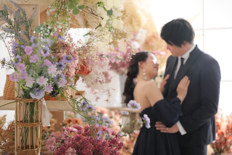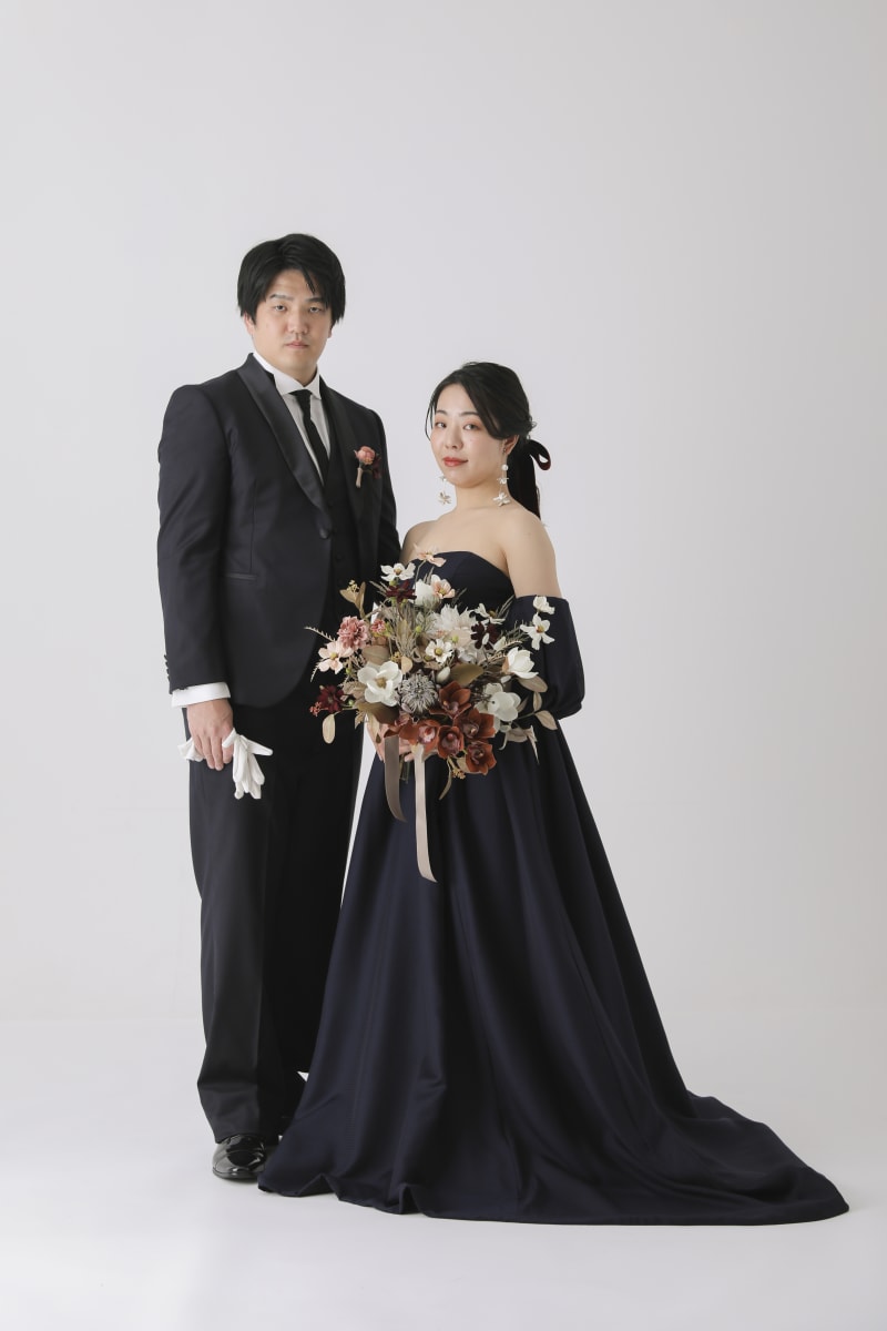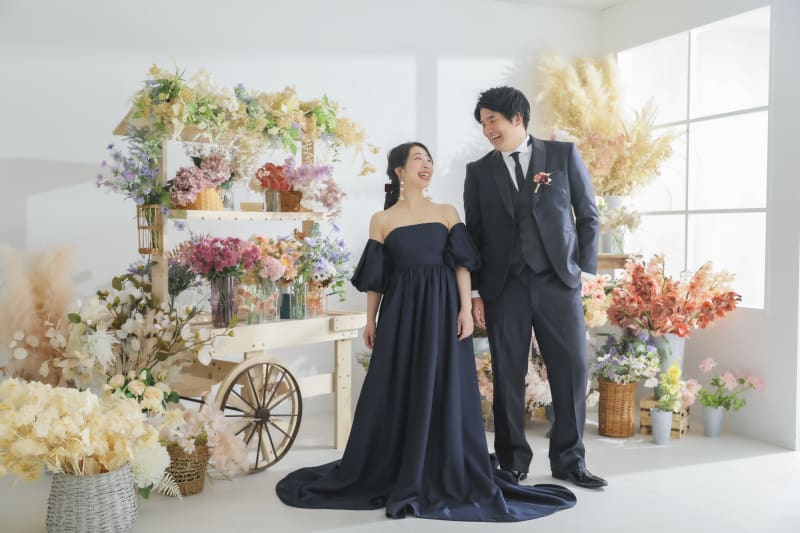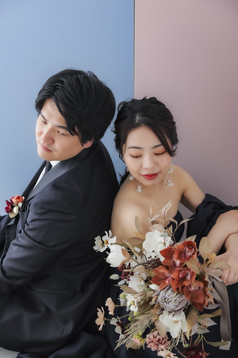 カラフルなお花の背景にあえてのシックなカラードレス。存在感が際立ちます。
