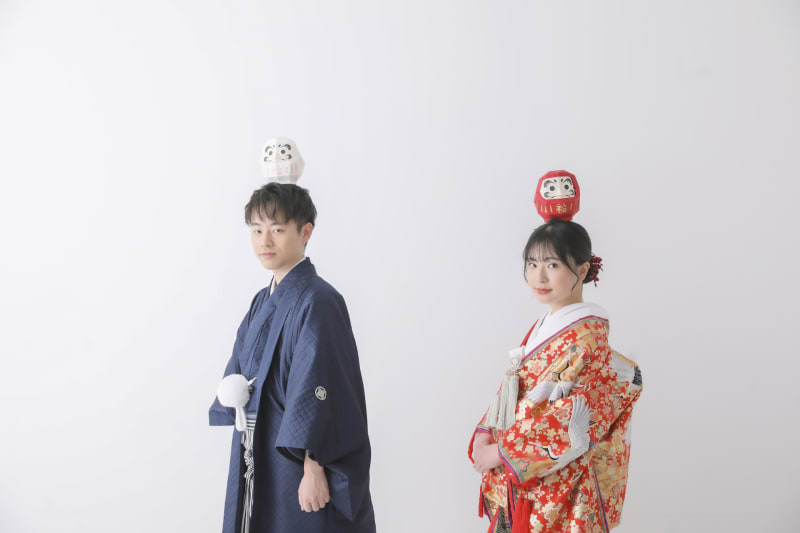お二人の両手に紅白のだるまがちょこんと乗っています。
