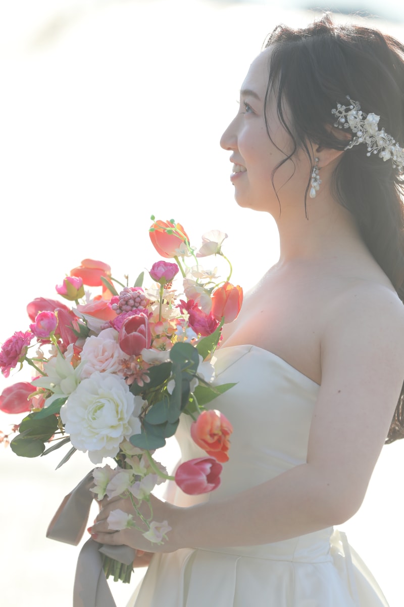 みなとみらいを背景に新婦様のソロショット。良い光が注ぎ込まれました