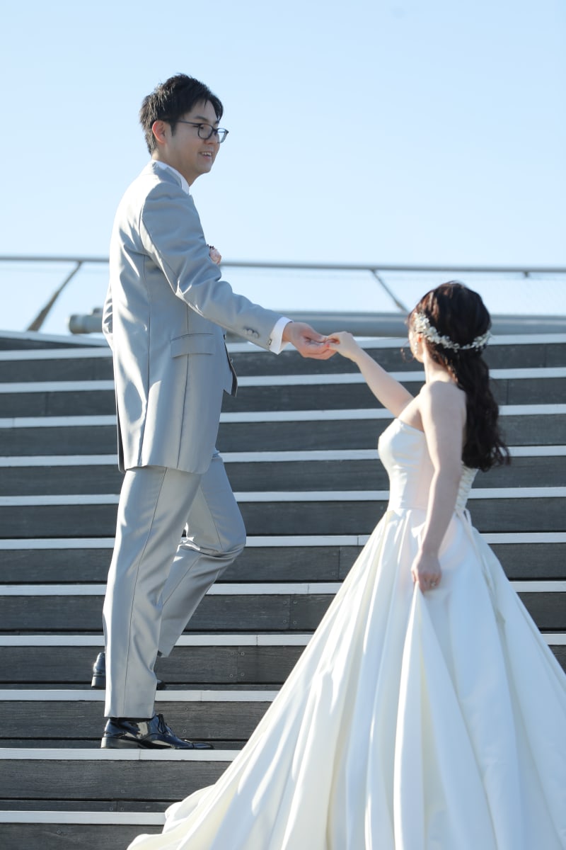 身長185cmの新郎様。エスコートする姿もスタイル抜群です