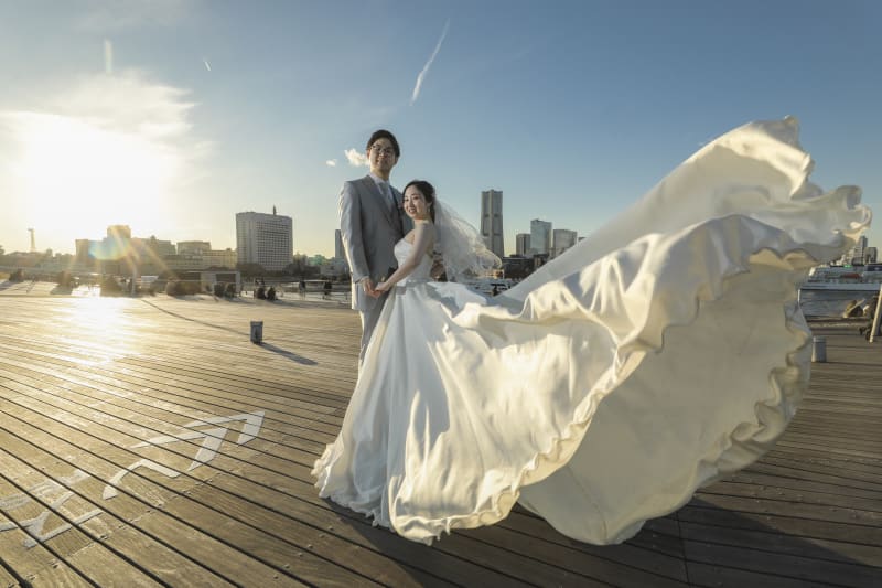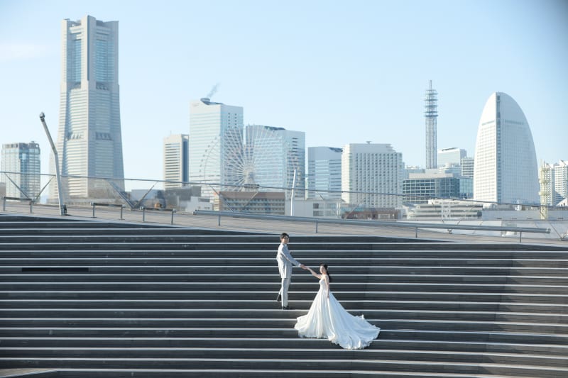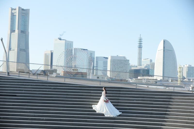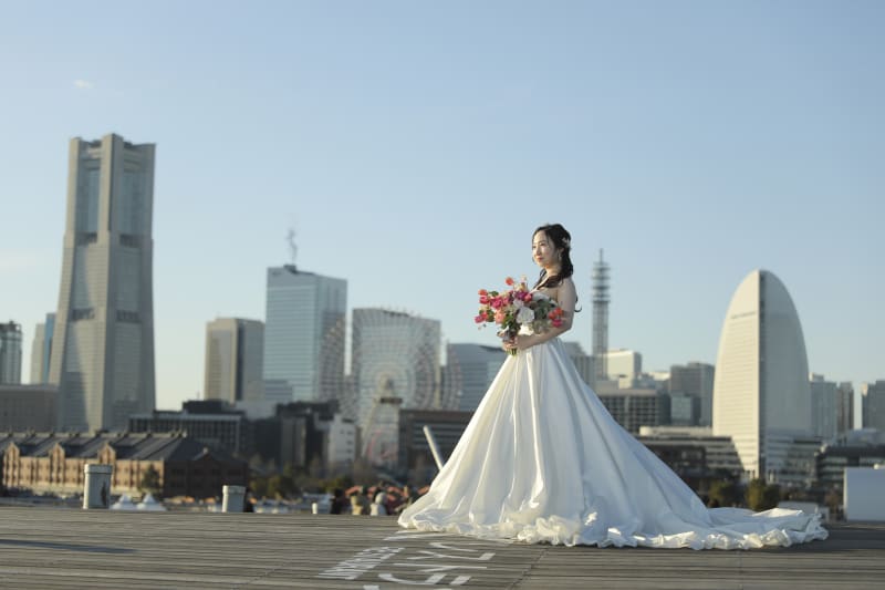 新婦様がどうしても撮りたかったショット。背景にはみなとみらいの街が
