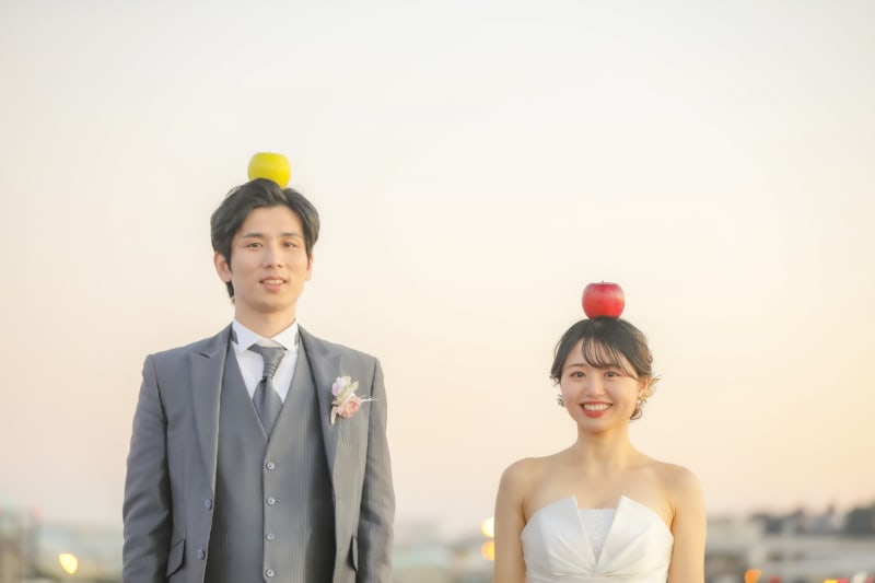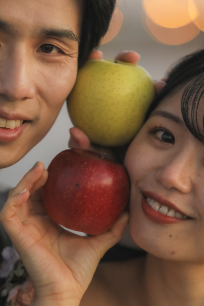 お二人の顔に挟んでギュッと。きっととても甘くて瑞々しい林檎でしょう