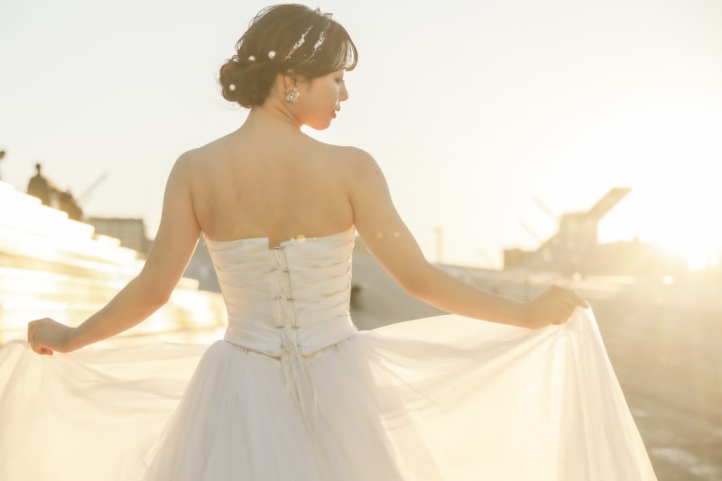 綺麗な夕陽が出ていたのでここで新婦様のバックショット。ドレスの透け感が美しい