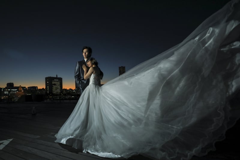 ボリュームのあるドレスだったのでダイナミックに動きをつけて。空のグラデーションも美しい