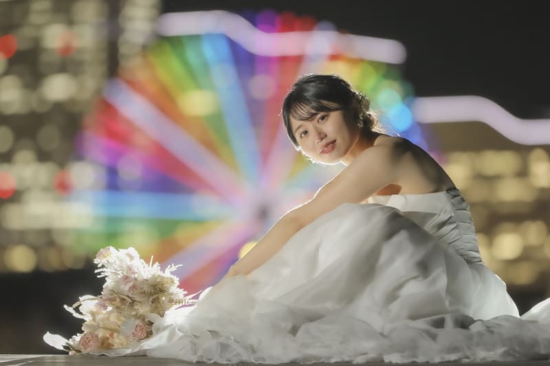こちらは新婦様ご希望のショット。ちょうど観覧車がレインボーに光りました。
