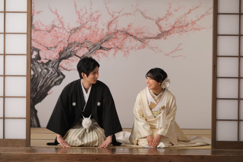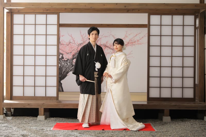 まずは和装でフォーマルスタイル。白と黒の色合いが背景によく合っています