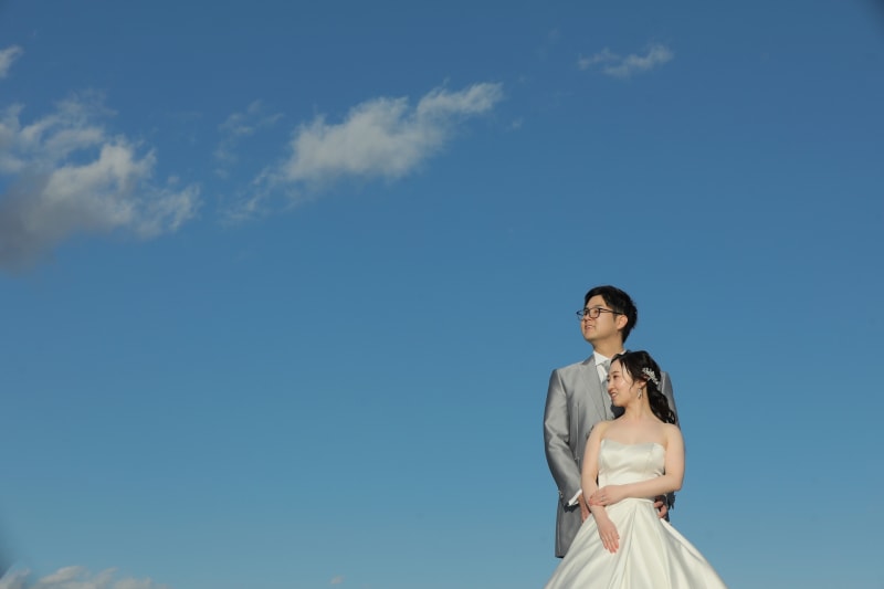 晴天の日は青い空一面を背景に撮影することもできます。かっこいいポージングもとてもお上手なお2人。