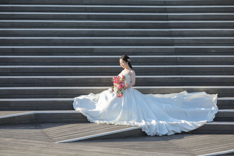 ボリューム感のあるドレスに、鮮やかなブーケが青空に映えていますね。