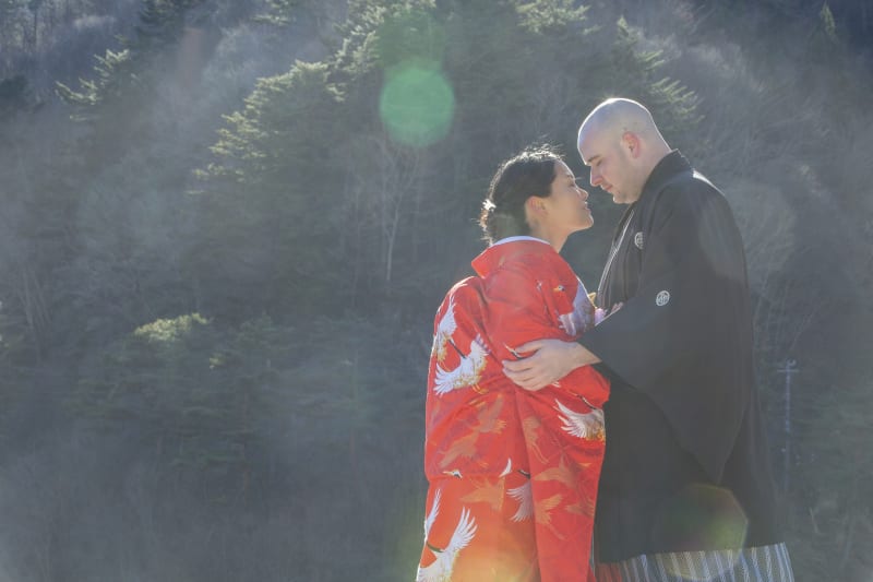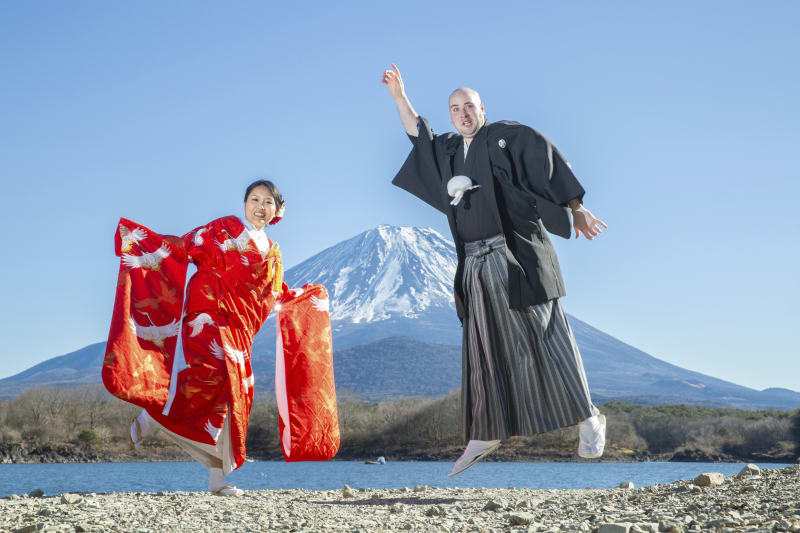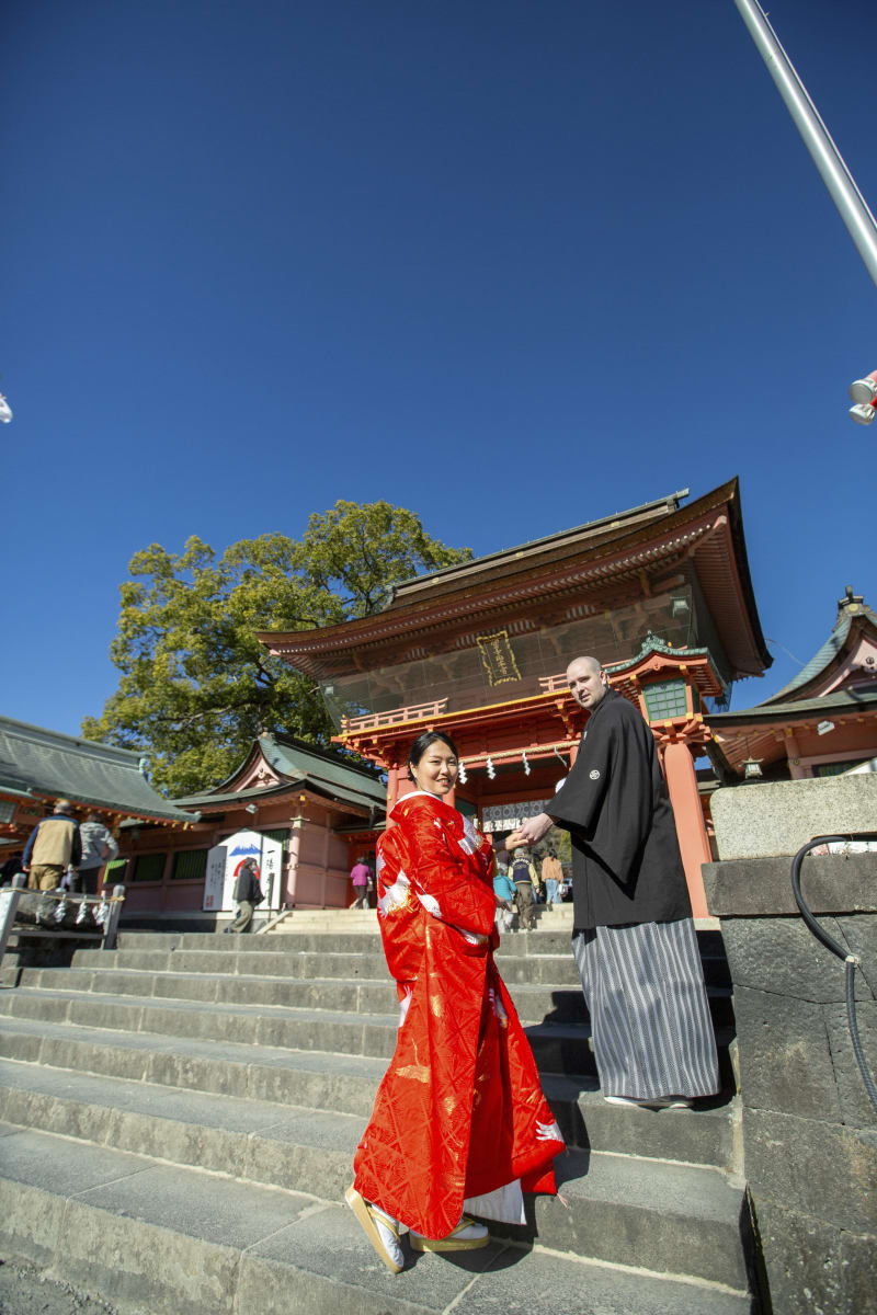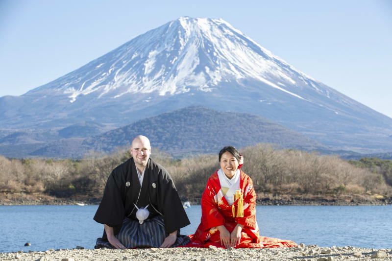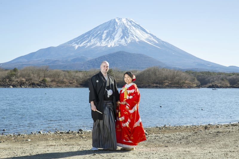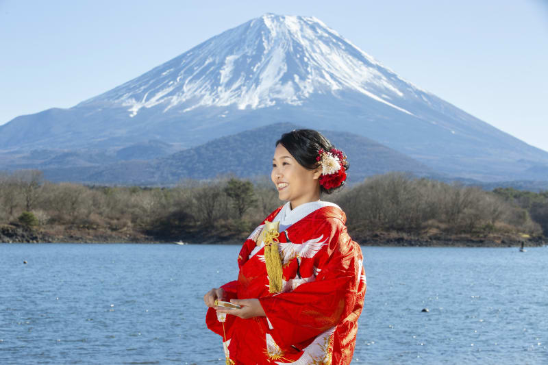 富士山を背景に赤の着物と新婦様の笑顔がより映えます。