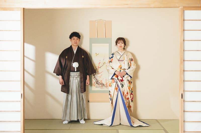 ご新婦様の黄色・オレンジが入った色打掛と、ご新郎様のブラウンの紋付が紅葉とマッチしていて