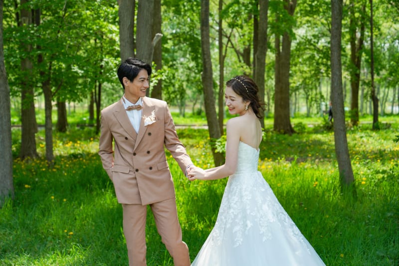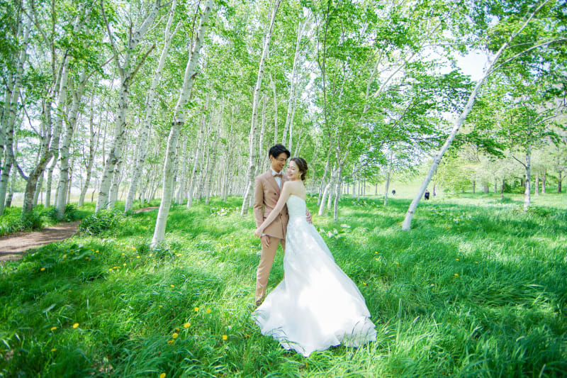 北海道に多く植生している白樺の木を背景にした1枚は、ナチュラルで可愛いウエディングフォトに♡