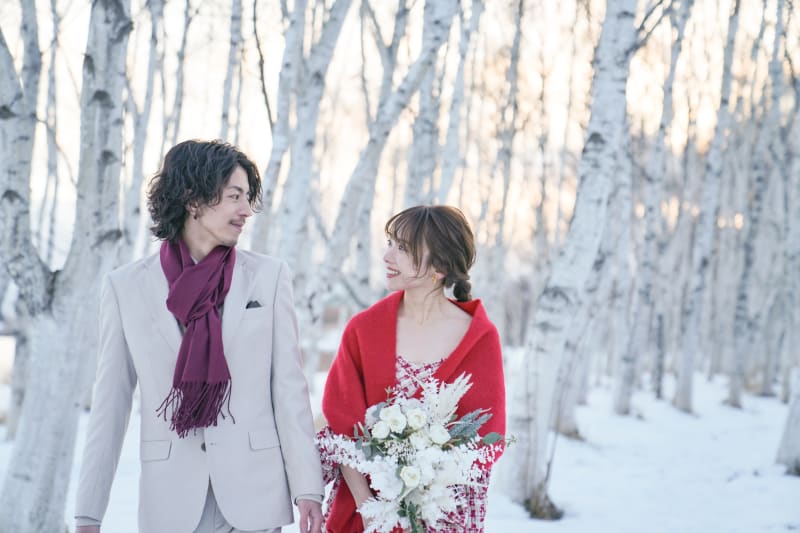 冬の白樺も素敵、、カラードレスと白樺のコントラストが綺麗です!